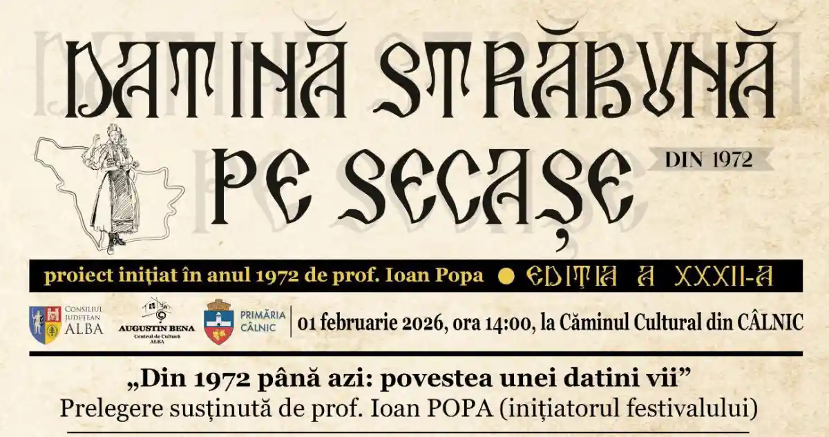 Spectacolul ,,Datină străbună pe Secașe” – ediția a XXXII-a va avea loc duminică, 1 februarie 2026, de la ora 14.00, la Căminul Cultural din Câlnic.