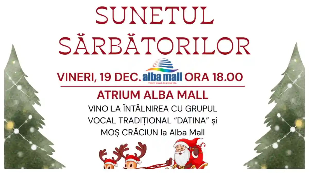 Mai exact, ziua de vineri este zi de sărbătoare la Alba Mall. Oamenii vor avea parte de un concert de colinde cu grupul vocal Datina, format din Marinela Baba, Marioara Dan Păucean și Teodora Zărnescu Craiu. Mai mult decât atât, Moș Crăciun o să vină pregătit cu daruri pentru ce mici: