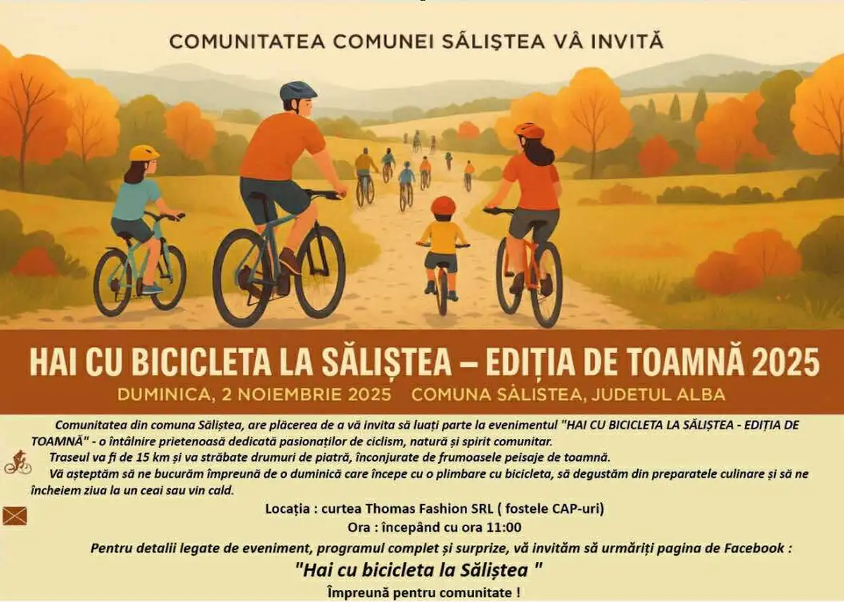 2 Noiembrie 2025 | Evenimentul „Hai cu bicicleta la Săliștea”, ajunge la ediția a IV-a. Locuitorii sunt invitați la o plimbare de toamnă pe două roți