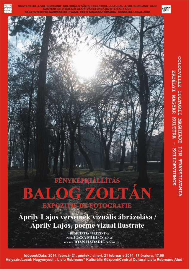 Expoziţie de fotografie: Balog Zoltán – Aprily Lajos, poeme vizual ilustrate, prezintă: prof. Józsa Miklós, poetul Ioan Hădărig