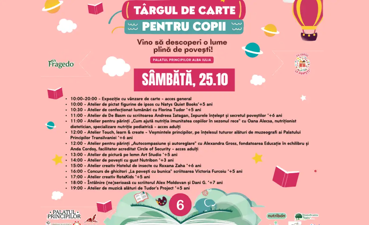 Între 24 și 26 octombrie 2025, Palatul Principilor din Alba Iulia găzduiește cea de-a VI-a ediție a Târgului de Carte pentru Copii, organizat de Asociația Cu copiii la povești. Evenimentul aduce împreună 19 expozanți, edituri și librării, oferind copiilor și părinților lansări de carte, ateliere creative, spectacole interactive și întâlniri cu autori, precum și activități pentru părinți. Târgul promovează lectura, educația și implicarea comunității prin donații și schimb de cărți, transformând Alba Iulia într-o veritabilă capitală a poveștilor pentru cei mici.