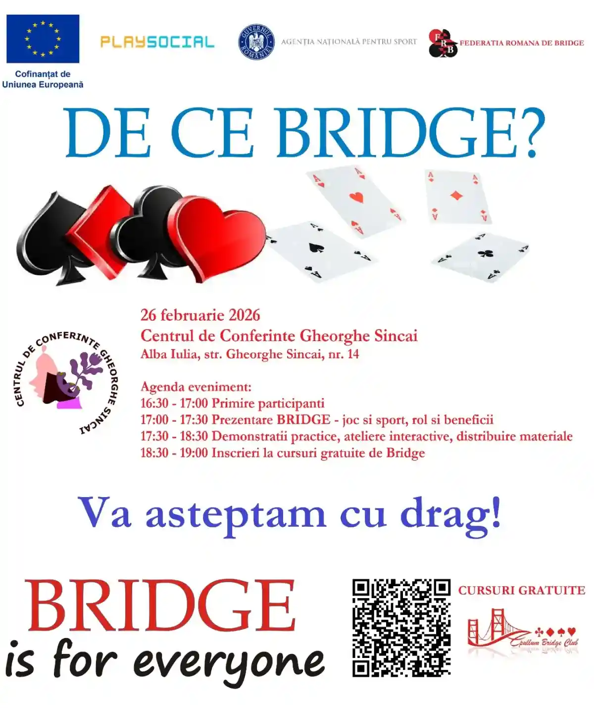 Agenția Națională pentru Sport (ANS) și Federația Română de Bridge organizează joi, 26 februarie 2026, de la ora 17.00, la Centrul de Conferințe „Gheorghe Şincai” din Alba Iulia, evenimentul „PlaySocial – De ce BRIDGE?”, un eveniment dedicat incluziunii prin sport.