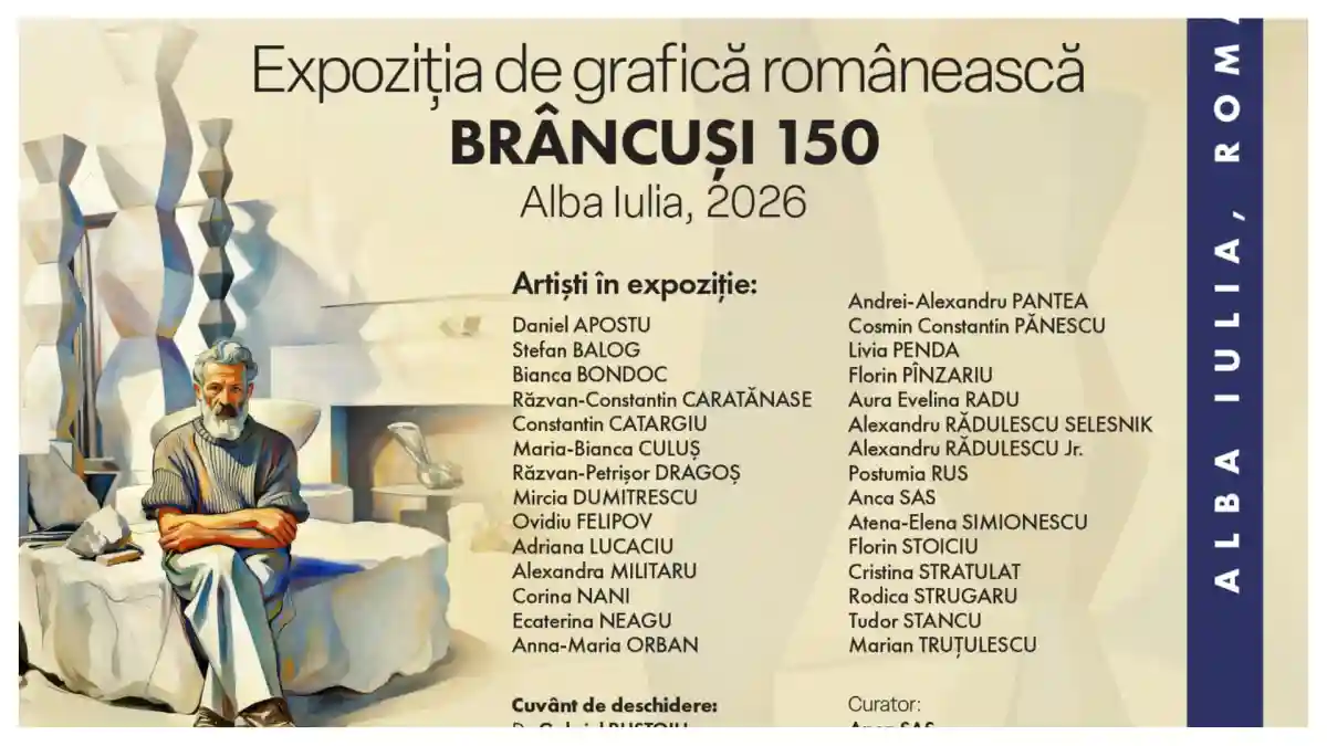 Muzeul Național al Unirii din Alba Iulia va găzdui, începând din 26 martie 2026, expoziția de grafică românească „Brâncuși 150”, un proiect dedicat marelui sculptor Constantin Brâncuși, care reunește lucrările a 29 de artiști contemporani.