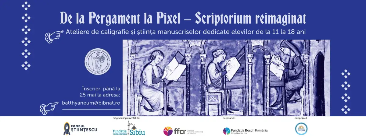 Proiectul „De la Pergament la Pixel – Scriptorium reimaginat” este finanțat prin Fondul Științescu Alba 3.0, fond implementat de Fundația Comunitară Sibiu, în parteneriat cu FFCR – Federația Fundațiile Comunitare din România, împreună cu partenerul local Fundația Bosch România, cu sprijinul ISJ Alba.