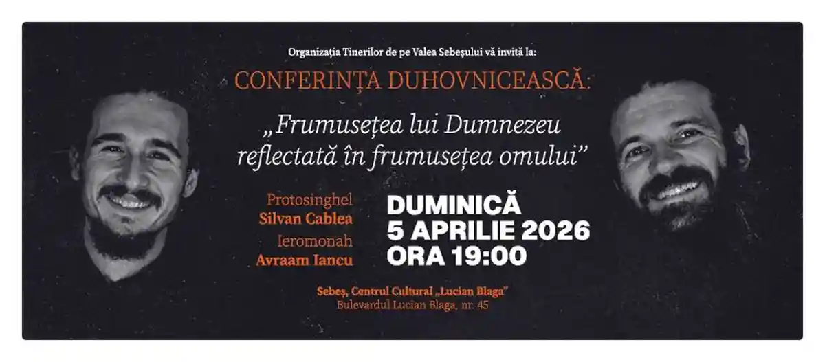Tinerilor de pe Valea Sebeșului, alături de Centrul Cultural „Lucian Blaga” Sebeș, vă invită la o seară de suflet, de reflecție și de întâlnire cu sensul profund al frumuseții adevărate, în cadrul conferinței duhovnicești: „Frumusețea lui Dumnezeu reflectată în frumusețea omului”. Întâlnirea va avea loc duminică, 5 aprilie 2026, la ora 19.00, în sala de evenimente a Centrului Cultural „Lucian Blaga” din Sebeș.