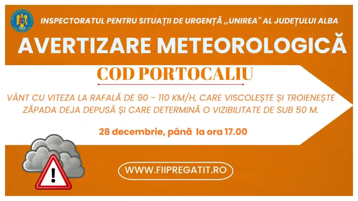 Administrația Națională de Meteorologie a emis o avertizare nowcasting de cod portocaliu valabilă în data de 28.12.2025 pâna la ora 17.00, potrivit ISU Alba.