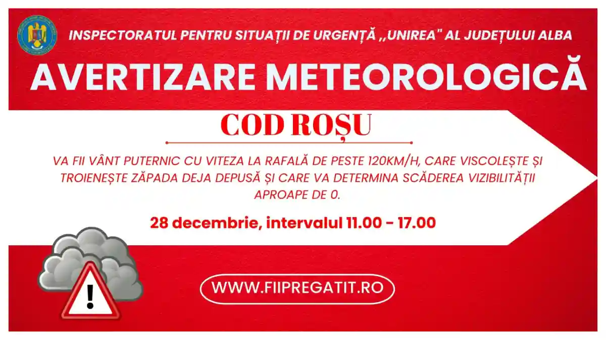 Un cod roșu avertizare nowcasting a fost emis pentru zona de munte de peste 1.800 de metri a județului Alba, astăzi, 28 decembrie. O mare parte din România se află sub avertizări de vreme rea.