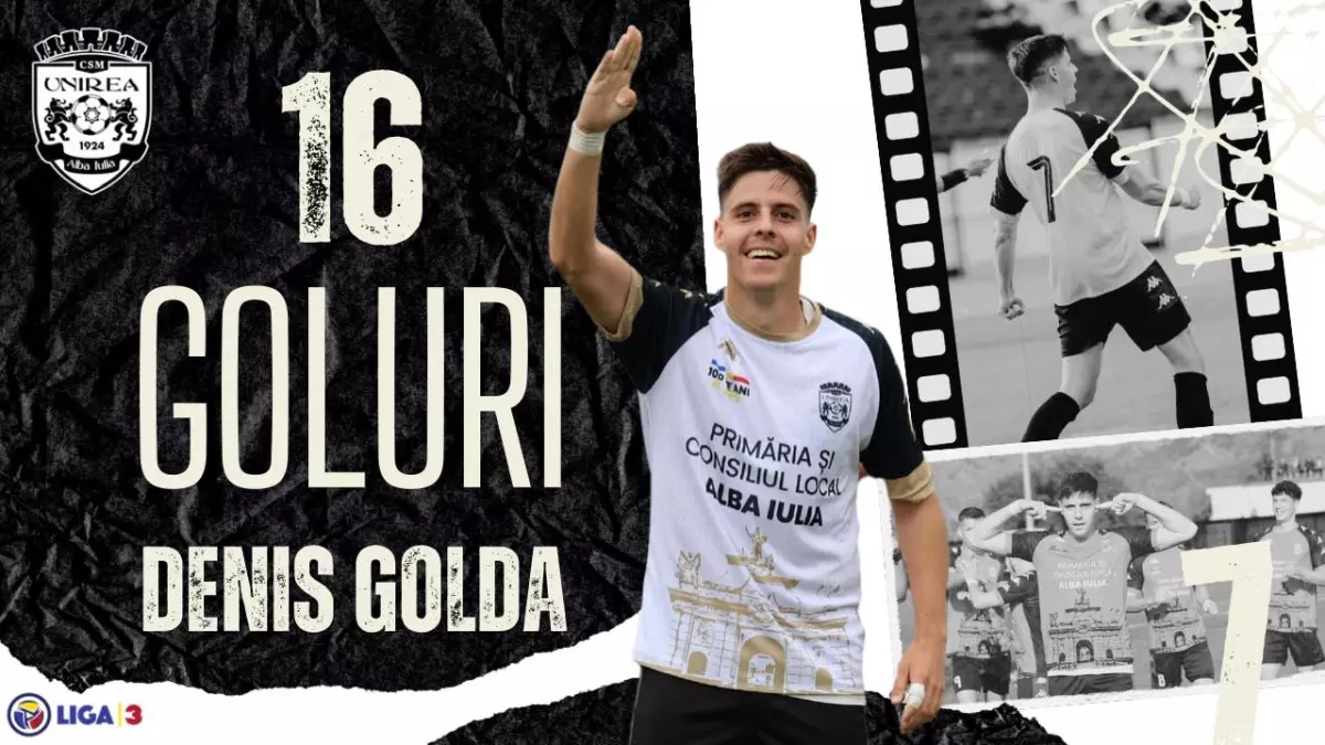 Atacantul Denis Golda, CSM Unirea Alba Iulia, este golgheterului Ligii 3 la finele anului 2025. Liderul Seriei 7 din eșalonul terț, formația „alb-negrilor”, cu cel mai prolific atac, dă și principalul marcator.