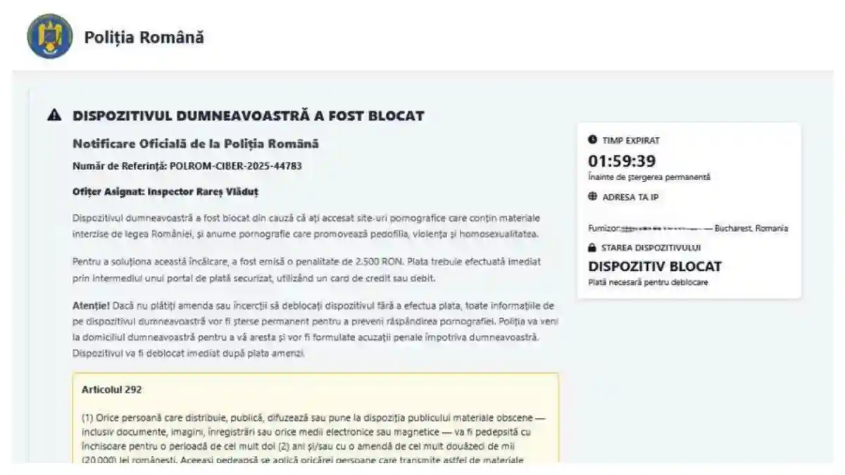 În ultima perioadă, au apărut mesaje și pagini false care pretind că provin de la Poliția Română și anunță că „dispozitivul a fost blocat” pentru a impune plata unei „amenzi”. Aceste mesaje sunt tentative de fraudă informatică (scam) menite să vă sperie și să vă determine să introduceți datele personale sau bancare.