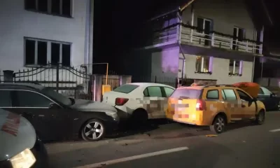 FOTO | ACCIDENT RUTIER în Aiud: Două persoane rănite după ce un autoturism a lovit două mașini parcate