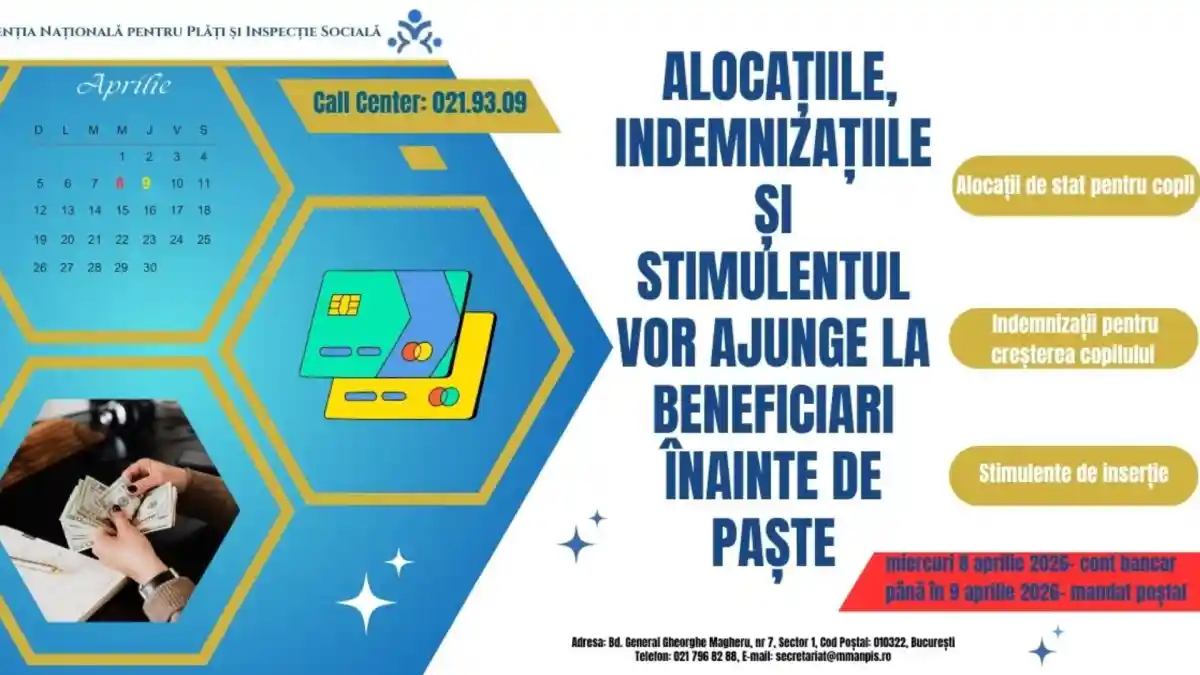Plata drepturilor în conturile bancare ale beneficiarilor se va realiza în 8 aprilie 2026. Agenția Națională pentru Plăți și Inspecție Socială, prin agențiile județene, a transmis către Compania Națională Poșta Română sumele necesare plății drepturilor de asistență socială pentru beneficiarii care au optat pentru primirea prestațiilor prin mandat poștal, astfel încât banii vor ajunge la destinație până la data de 9 aprilie a.c.