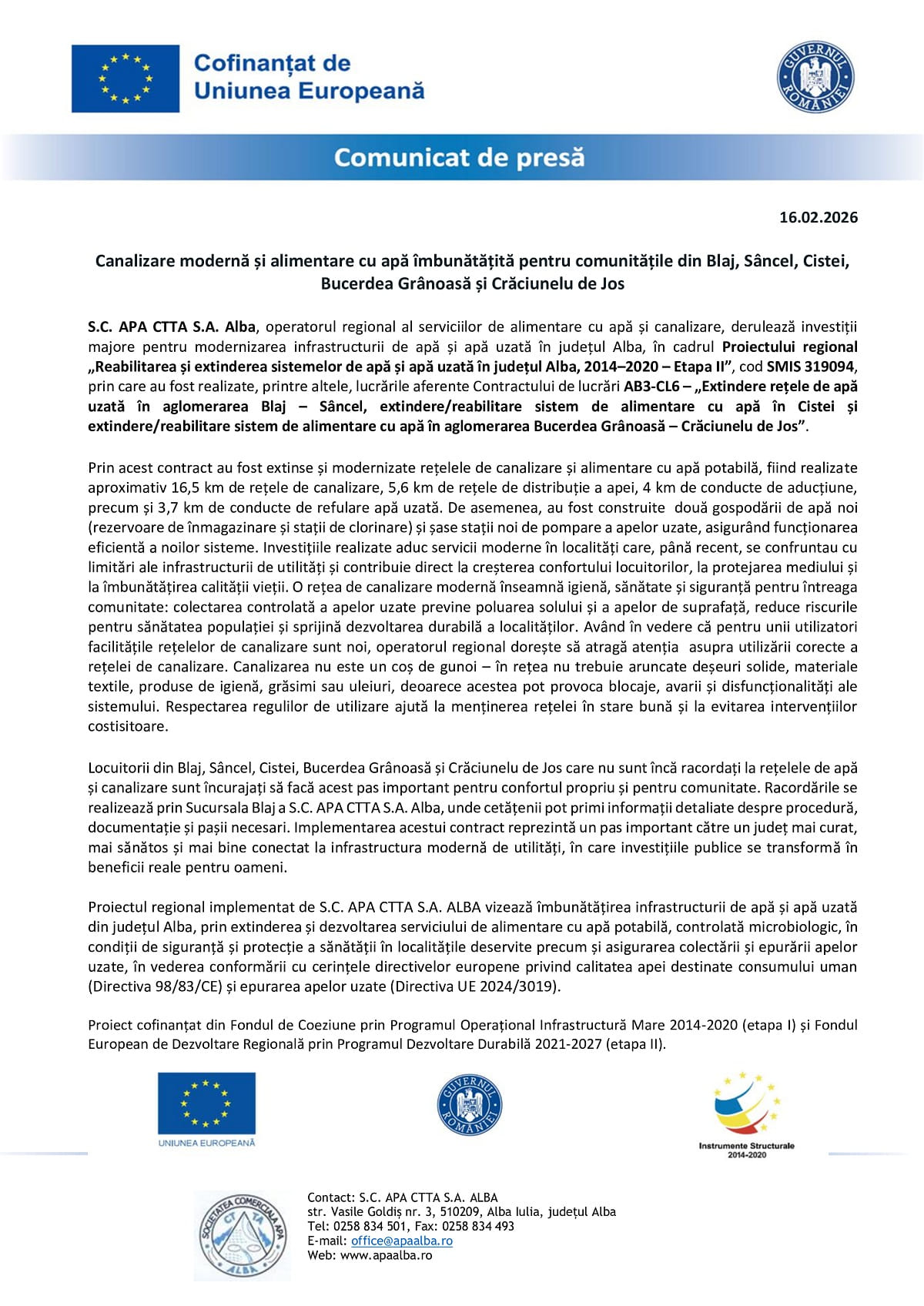 Comunicat de presă – 16 februarie 2026: Canalizare modernă și alimentare cu apă îmbunătățită pentru comunitățile din Blaj, Sâncel, Cistei, Bucerdea Grânoasă și Crăciunelu de Jos