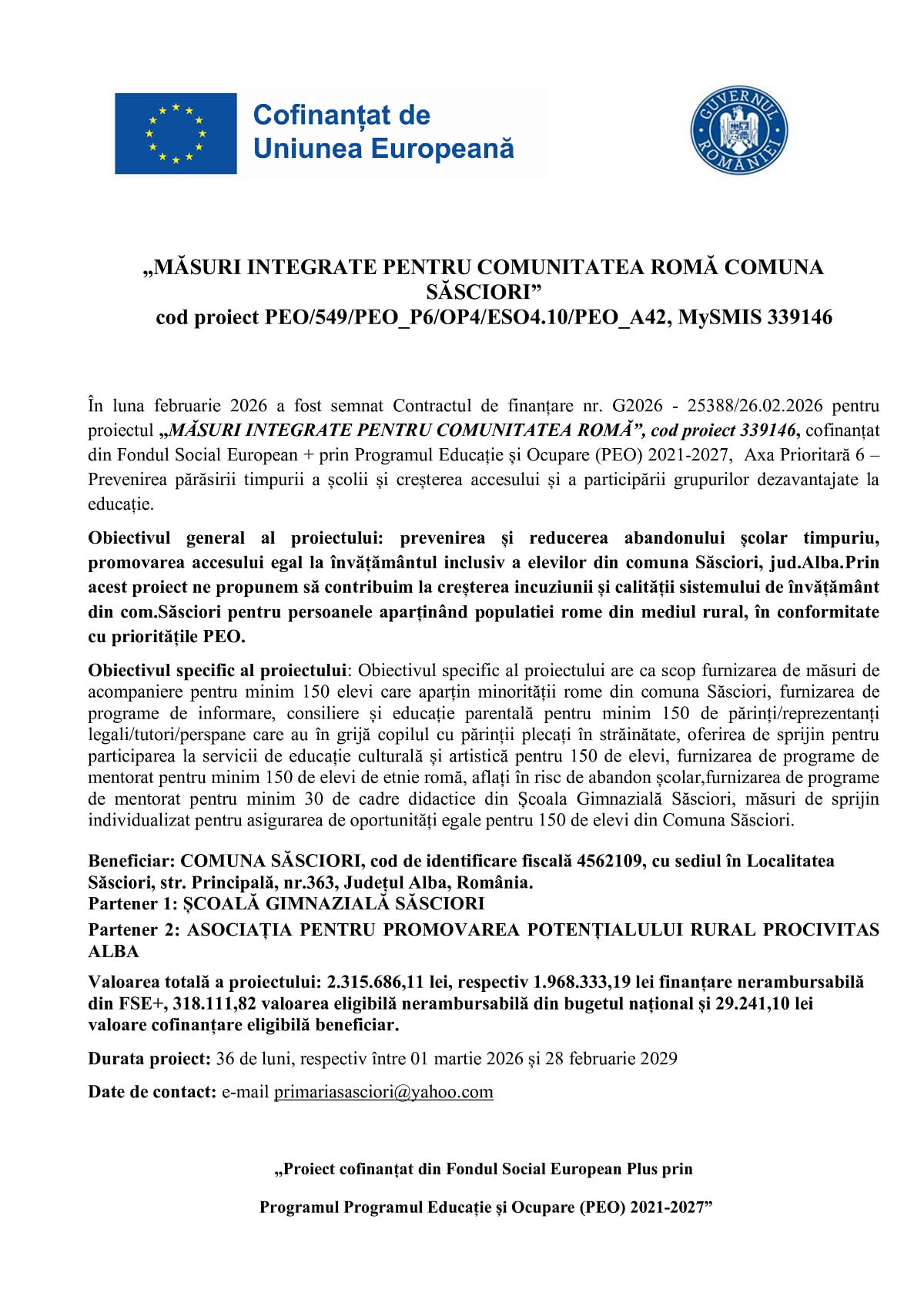 În luna februarie 2026 a fost semnat Contractul de finanțare nr. G2026 – 25388/26.02.2026 pentru proiectul „MĂSURI INTEGRATE PENTRU COMUNITATEA ROMĂ”, cod proiect 339146, cofinanțat din Fondul Social European + prin Programul Educație și Ocupare (PEO) 2021-2027, Axa Prioritară 6 – Prevenirea părăsirii timpurii a școlii și creșterea accesului și a participării grupurilor dezavantajate la educație.