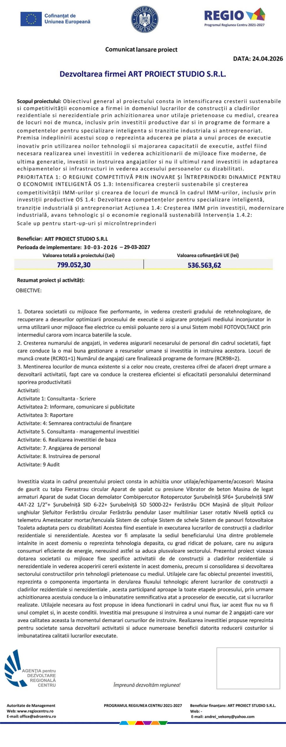 Comunicat de presă – 24 aprilie 2026: Anunț lansare proiect „Dezvoltarea firmei ART PROIECT STUDIO S.R.L.”