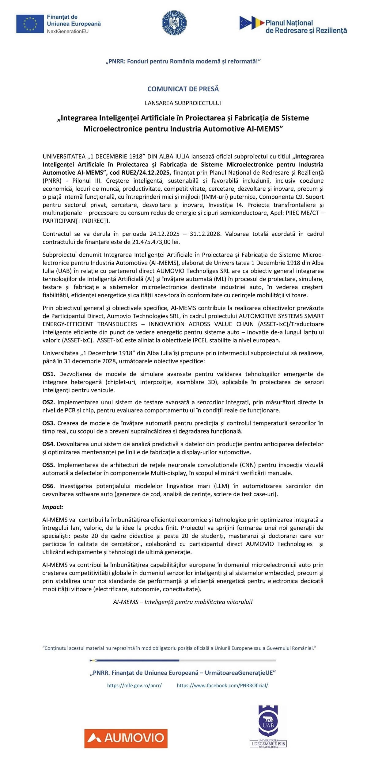 UNIVERSITATEA „1 DECEMBRIE 1918” DIN ALBA IULIA lansează oficial subproiectul cu titlul „Integrarea Inteligenței Artificiale în Proiectarea și Fabricația de Sisteme Microelectronice pentru Industria Automotive AI-MEMS”, cod RUE2/24.12.2025, finanțat prin Planul Național de Redresare și Reziliență (PNRR) – Pilonul III. Creștere inteligentă, sustenabilă și favorabilă incluziunii, inclusiv coeziune economică, locuri de muncă, productivitate, competitivitate, cercetare, dezvoltare și inovare, precum și o piață internă funcțională, cu întreprinderi mici și mijlocii (IMM-uri) puternice, Componenta C9. Suport pentru sectorul privat, cercetare, dezvoltare și inovare, Investiția I4. Proiecte transfrontaliere și multinaționale – procesoare cu consum redus de energie și cipuri semiconductoare, Apel: PIIEC ME/CT – PARTICIPANȚI INDIRECȚI.