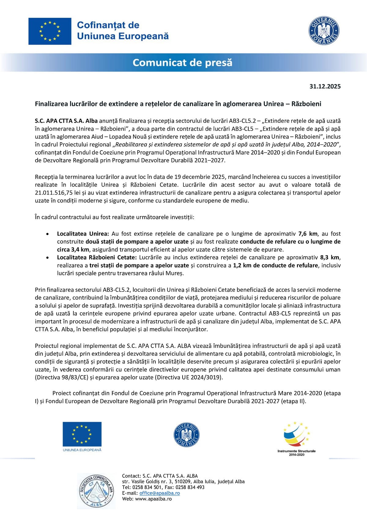 S.C. APA CTTA S.A. Alba anunță finalizarea și recepția sectorului de lucrări AB3-CL5.2 – „Extindere rețele de apă uzată în aglomerarea Unirea – Războieni”, a doua parte din contractul de lucrări AB3-CL5 – „Extindere rețele de apă și apă uzată în aglomerarea Aiud – Lopadea Nouă și extindere rețele de apă uzată în aglomerarea Unirea – Războieni”, inclus în cadrul Proiectului regional „Reabilitarea și extinderea sistemelor de apă și apă uzată în județul Alba, 2014–2020”, cofinanțat din Fondul de Coeziune prin Programul Operațional Infrastructură Mare 2014–2020 și din Fondul European de Dezvoltare Regională prin Programul Dezvoltare Durabilă 2021–2027.