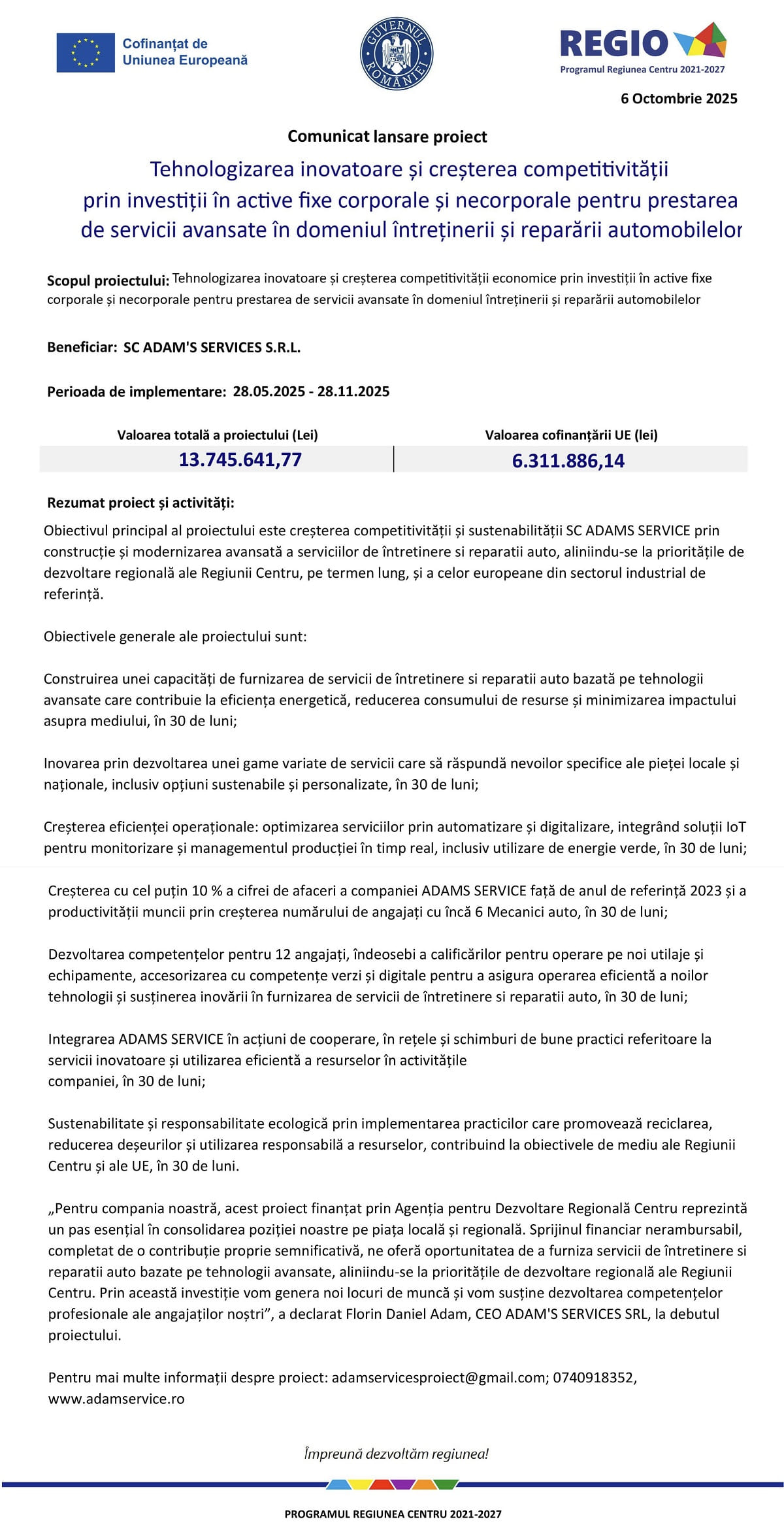 Comunicat de presă 6 octombrie 2025 – ADAMS SERVICES: Tehnologizarea inovatoare și creșterea competitivității prin investiții în active fixe corporale și necorporale pentru prestarea de servicii avansate în domeniul întreținerii și reparării automobile