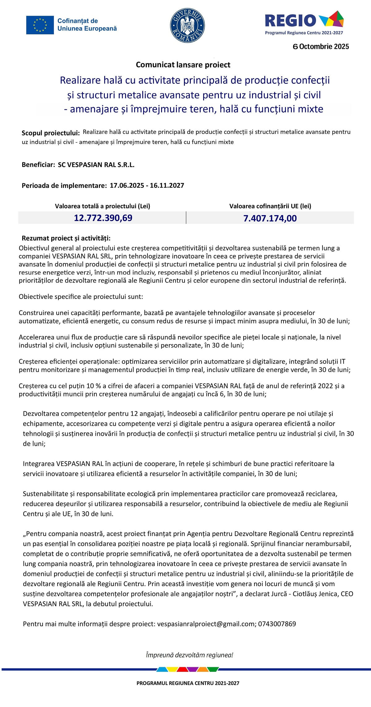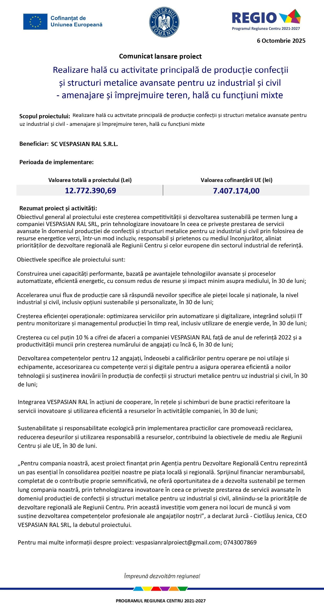 Comunicat de presă 6 octombrie 2025 – VESPASIAN RAL: Realizare hală cu activitate principală de producție confecții și structuri metalice avansate pentru uz industrial și civil – amenajare și împrejmuire teren, hală cu funcțiuni mixte