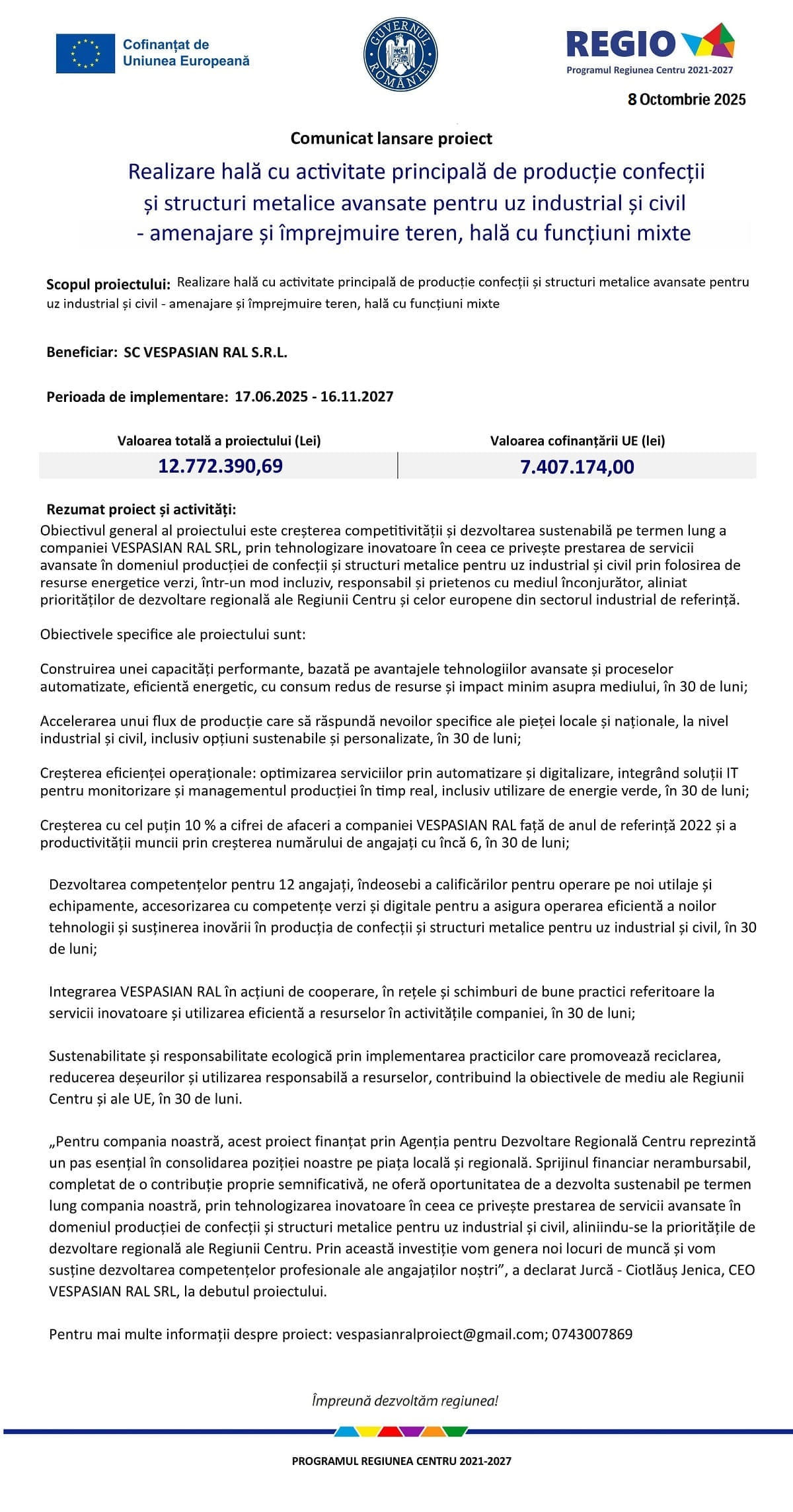 Comunicat de presă 8 octombrie 2025 – VESPASIAN RAL: Realizare hală cu activitate principală de producție confecții și structuri metalice avansate pentru uz industrial și civil – amenajare și împrejmuire teren, hală cu funcțiuni mixte