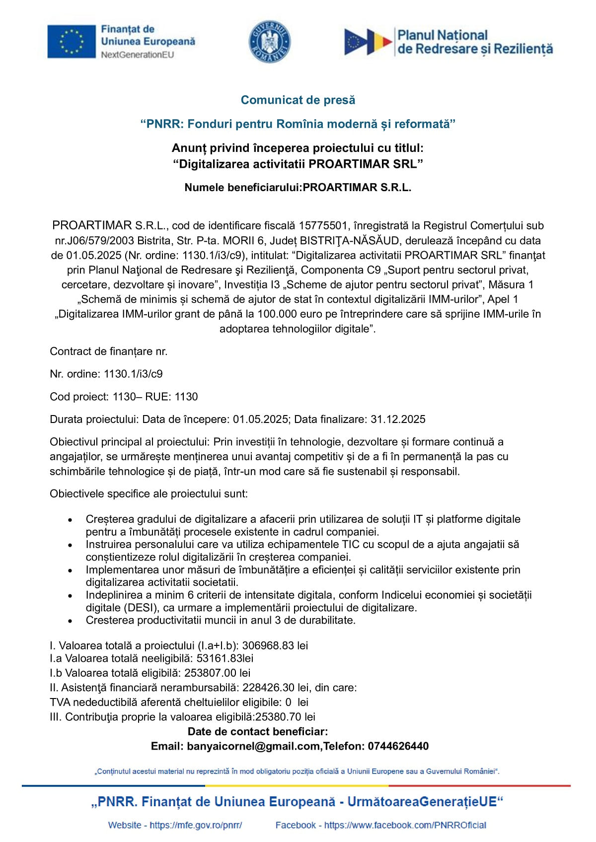 PROARTIMAR S.R.L., cod de identificare fiscală 15775501, înregistrată la Registrul Comerțului sub nr. J06/579/2003 Bistrita, Str. P-ta. MORII 6, Județ BISTRIŢA-NĂSĂUD, derulează începând cu data de 01.05.2025 (Nr. ordine: 1130.1/i3/c9), intitulat: „Digitalizarea activitatii PROARTIMAR SRL” finanţat prin Planul Naţional de Redresare şi Rezilienţă, Componenta C9 „Suport pentru sectorul privat, cercetare, dezvoltare și inovare”, Investiția I3 „Scheme de ajutor pentru sectorul privat”, Măsura 1 „Schemă de minimis și schemă de ajutor de stat în contextul digitalizării IMM-urilor”, Apel 1 „Digitalizarea IMM-urilor grant de până la 100.000 euro pe întreprindere care să sprijine IMM-urile în adoptarea tehnologiilor digitale”.