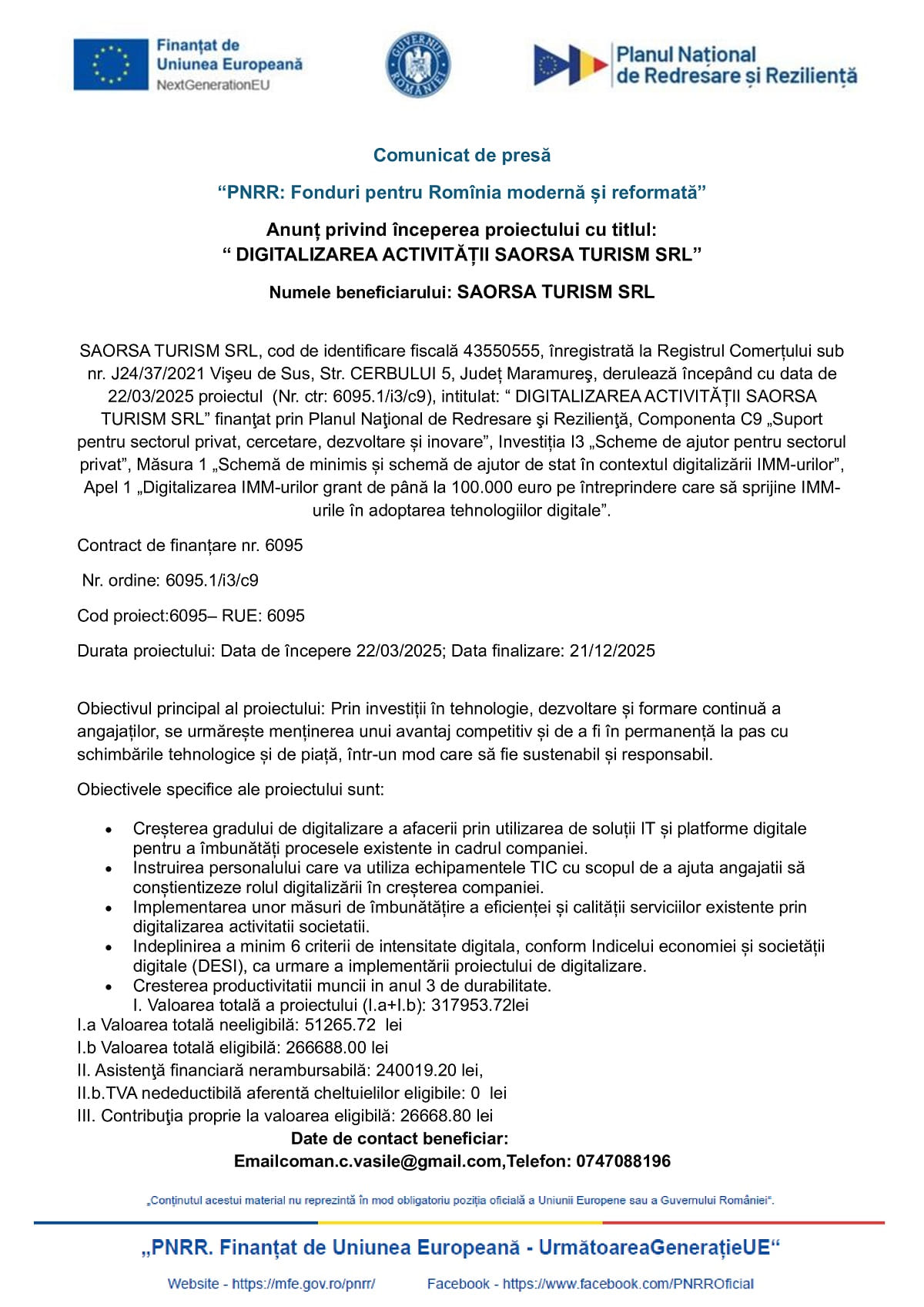 Comunicat de presă PNRR: Anunț privind începerea proiectului cu titlul „DIGITALIZAREA ACTIVITĂȚII SAORSA TURISM SRL”