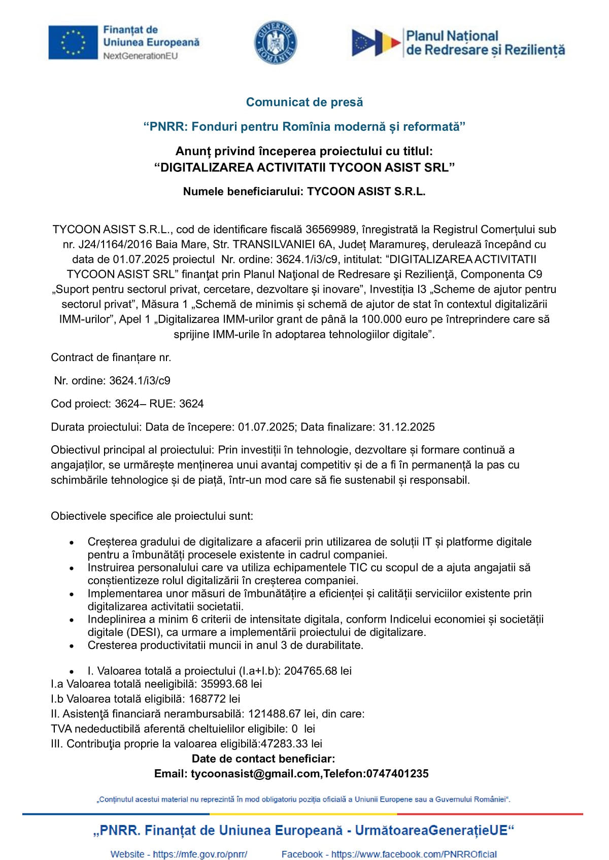 TYCOON ASIST S.R.L., cod de identificare fiscală 36569989, înregistrată la Registrul Comerțului sub nr. J24/1164/2016 Baia Mare, Str. TRANSILVANIEI 6A, Județ Maramureş, derulează începând cu data de 01.07.2025 proiectul Nr. ordine: 3624.1/i3/c9, intitulat: “DIGITALIZAREA ACTIVITATII TYCOON ASIST SRL” finanţat prin Planul Naţional de Redresare şi Rezilienţă, Componenta C9 „Suport pentru sectorul privat, cercetare, dezvoltare și inovare”, Investiția I3 „Scheme de ajutor pentru sectorul privat”, Măsura 1 „Schemă de minimis și schemă de ajutor de stat în contextul digitalizării IMM-urilor”, Apel 1 „Digitalizarea IMM-urilor grant de până la 100.000 euro pe întreprindere care să sprijine IMM-urile în adoptarea tehnologiilor digitale”.