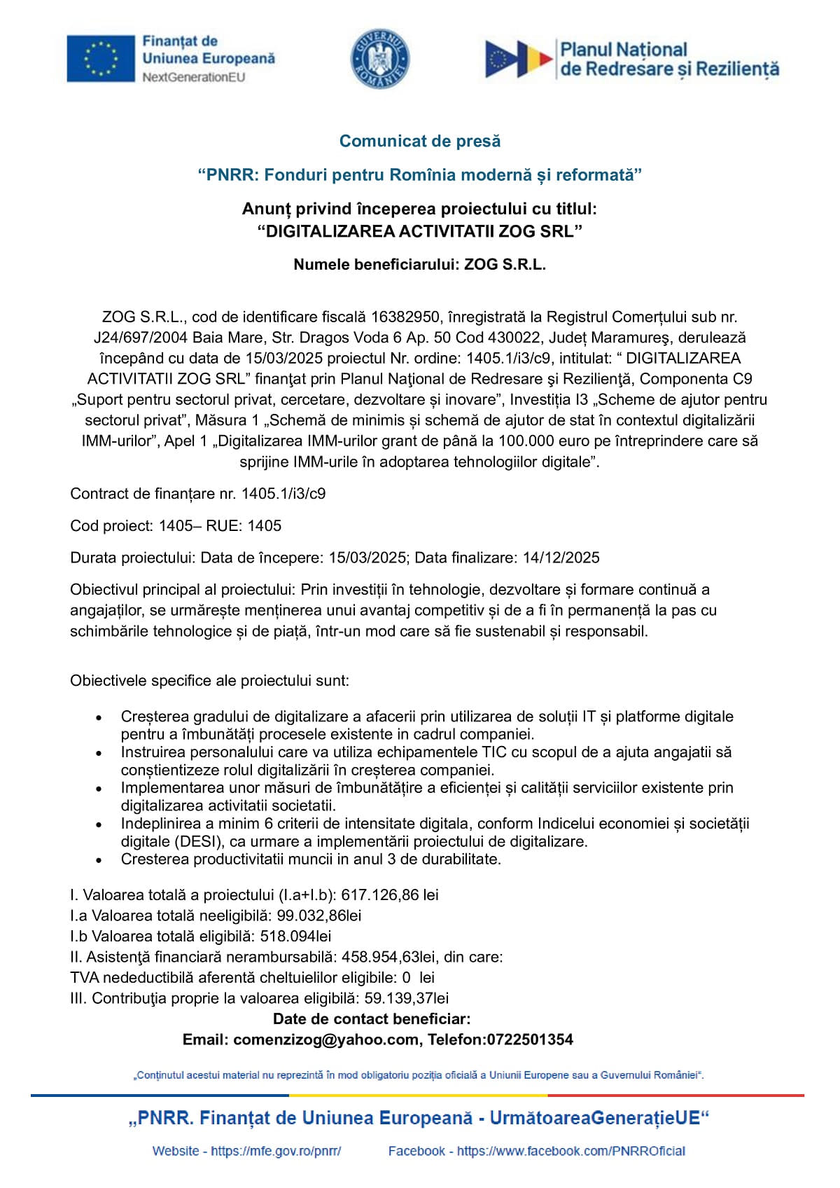 ZOG S.R.L., cod de identificare fiscală 16382950, înregistrată la Registrul Comerțului sub nr. J24/697/2004 Baia Mare, Str. Dragos Voda 6 Ap. 50 Cod 430022, Județ Maramureş, derulează începând cu data de 15/03/2025 proiectul Nr. ordine: 1405.1/i3/c9, intitulat: “DIGITALIZAREA ACTIVITATII ZOG SRL” finanţat prin Planul Naţional de Redresare şi Rezilienţă, Componenta C9 „Suport pentru sectorul privat, cercetare, dezvoltare și inovare”, Investiția I3 „Scheme de ajutor pentru sectorul privat”, Măsura 1 „Schemă de minimis și schemă de ajutor de stat în contextul digitalizării IMM-urilor”, Apel 1 „Digitalizarea IMM-urilor grant de până la 100.000 euro pe întreprindere care să sprijine IMM-urile în adoptarea tehnologiilor digitale”.