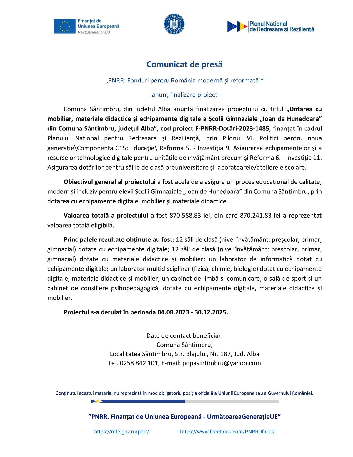 Comunicat de presă PNRR: „Dotarea cu mobilier, materiale didactice și echipamente digitale a Școlii Gimnaziale „Ioan de Hunedoara” din Comuna Sântimbru, județul Alba”