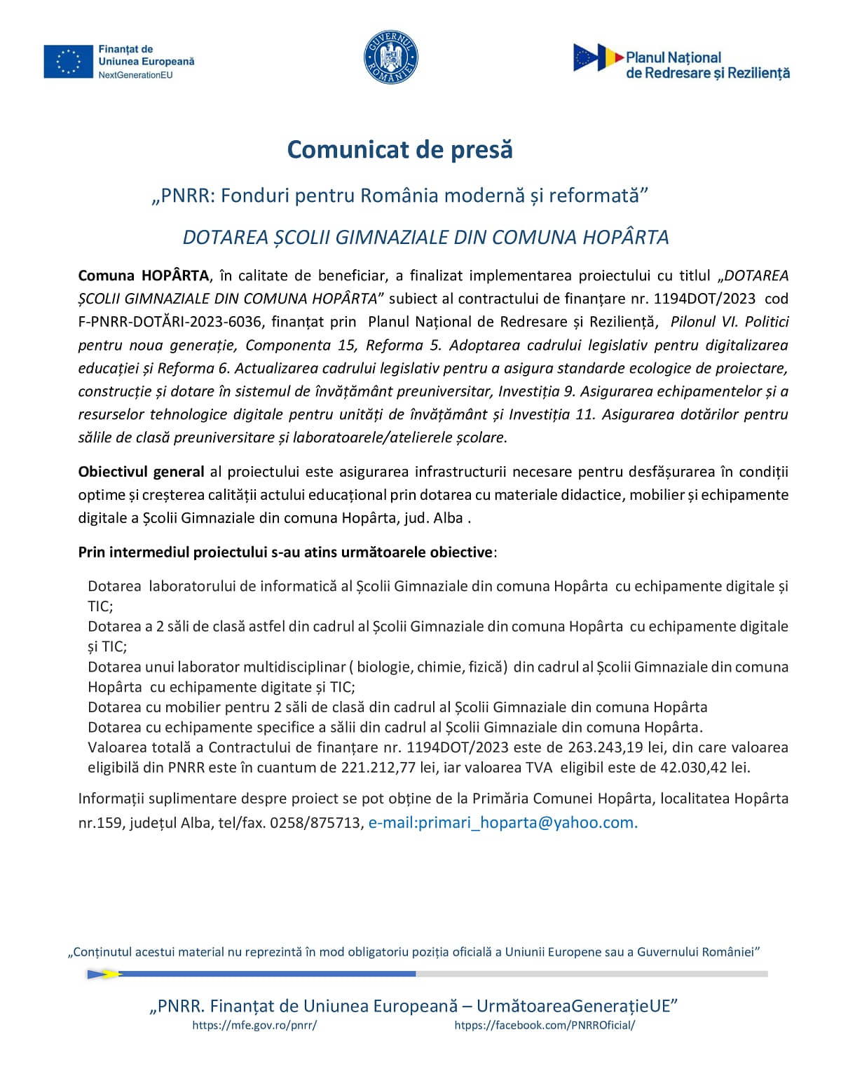 Comunicat de presă PNRR – Fianlizare Proiect „Dotatea Școlii Gimnaziale din comuna Hopârta”