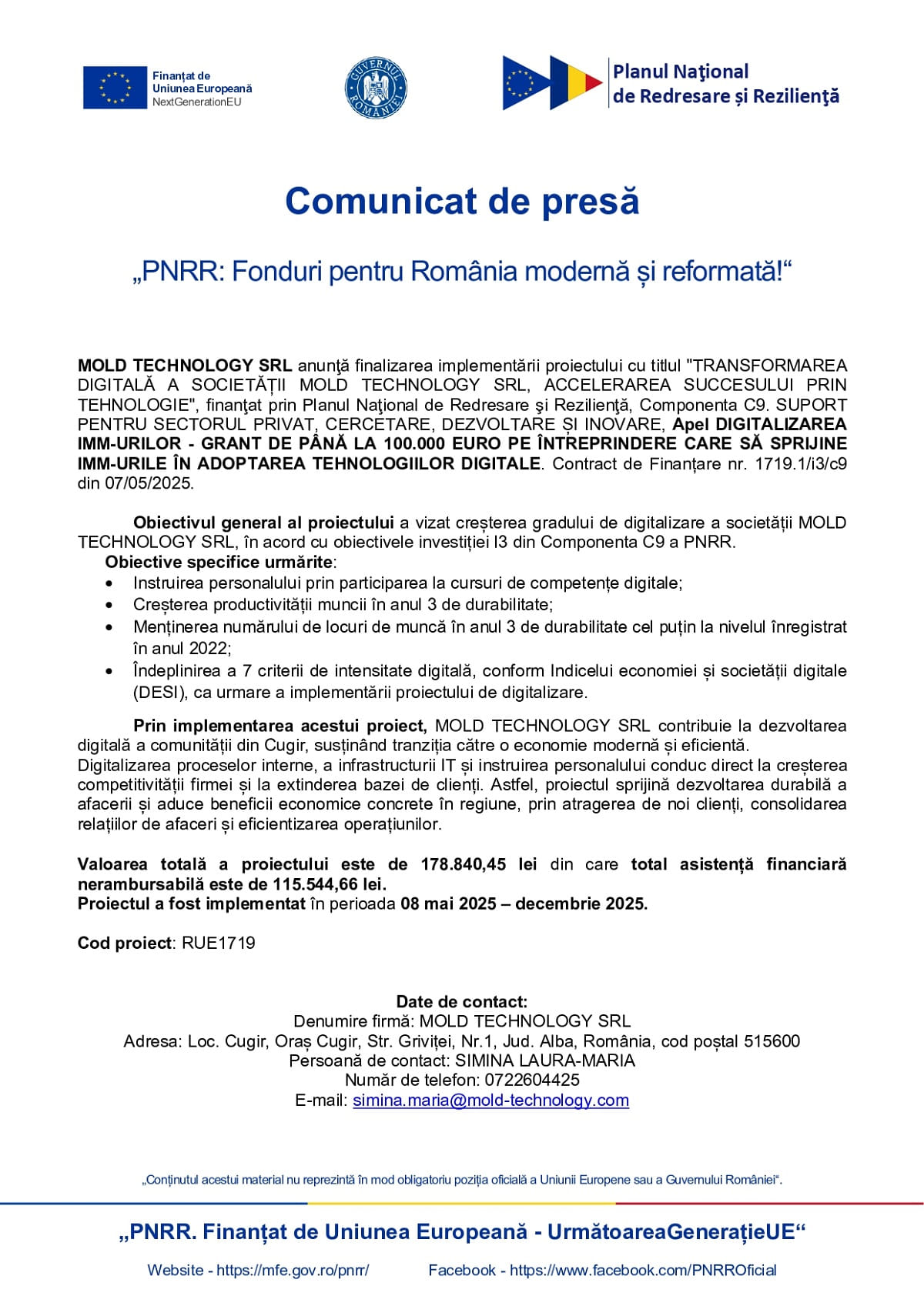 MOLD TECHNOLOGY SRL anunţă finalizarea implementării proiectului cu titlul „TRANSFORMAREA DIGITALĂ A SOCIETĂȚII MOLD TECHNOLOGY SRL, ACCELERAREA SUCCESULUI PRIN TEHNOLOGIE”, finanţat prin Planul Naţional de Redresare şi Rezilienţă, Componenta C9. SUPORT PENTRU SECTORUL PRIVAT, CERCETARE, DEZVOLTARE ȘI INOVARE, Apel DIGITALIZAREA IMM-URILOR – GRANT DE PÂNĂ LA 100.000 EURO PE ÎNTREPRINDERE CARE SĂ SPRIJINE IMM-URILE ÎN ADOPTAREA TEHNOLOGIILOR DIGITALE. Contract de Finanțare nr. 1719.1/i3/c9 din 07/05/2025.