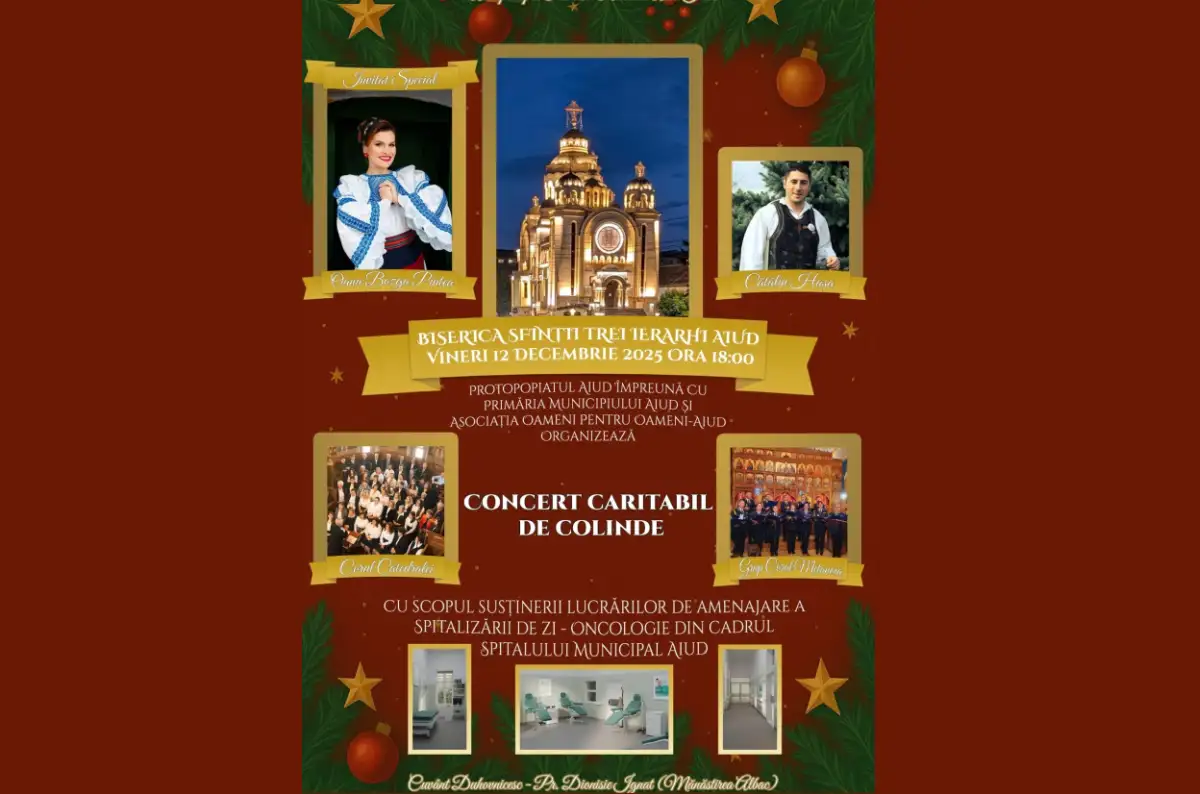 Un concert caritabil de colinde va avea loc vineri, 12 decembrie, de la ora 18:00, în Biserica „Sfinții Trei Ierarhi” Aiud, pentru a sprijini lucrările de amenajare a spitalizării de zi, secția Oncologie, din cadrul Spitalului Municipal Aiud. Evenimentul este organizat de asociația „Oameni pentru Oameni” și reunește artiști și grupuri corale care s-au alăturat acestei inițiative.