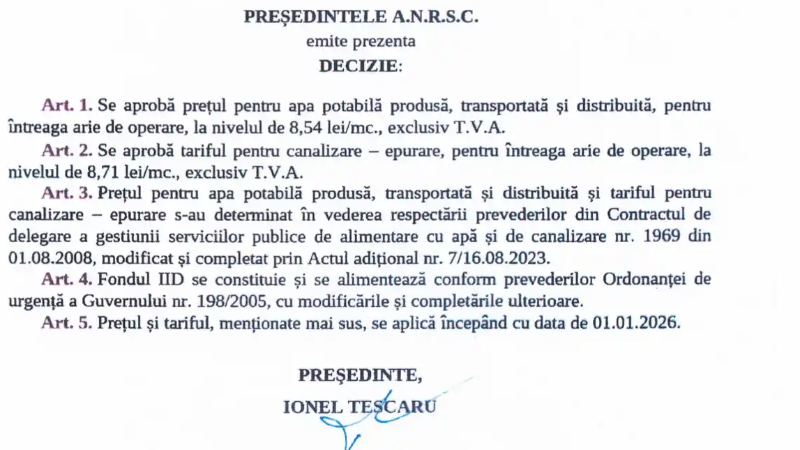 „Prețul (n.a. ajustat) este fixat în urma deciziei 157/03.12.2025 a ANRSC privind modificarea prețurilor la apă potabilă și a tarifelor la canalizare.