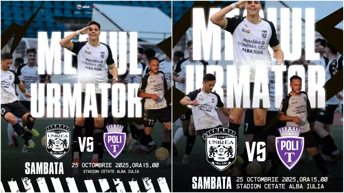 Derby de top pe „Cetate”: CSM Unirea Alba Iulia – Știința Poli Timișoara. CSM Unirea Alba Iulia va disputa sâmbătă, 25 octombrie 2025, de la ora 15.00, pe Stadionul „Cetate”, meciul cu Știința Poli Timișoara, formația aflată pe locul secund în Seria 7 a Ligii a 3-a, cu 5 puncte în spate.