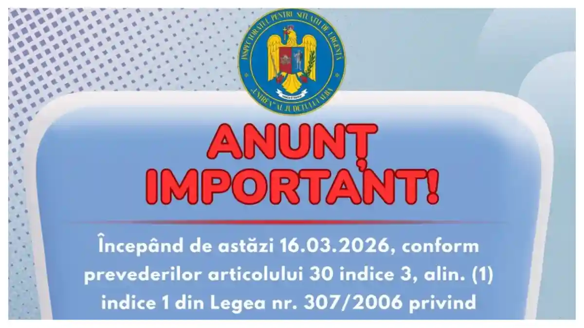 Începând de astăzi 16.03.2026, conform prevederilor articolului 30 indice 3, alin. (1) indice 1 din Legea nr. 307/2006 privind apărarea împotriva incendiilor, modificată prin OUG nr. 17 din 12.03.2026 și publicată în Monitorul Oficial, procedura de depunere a documentațiilor se realizează EXCLUSIV în format electronic!