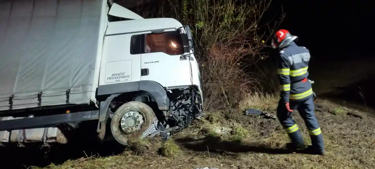 Un accident rutier a avut loc joi noaptea, în jurul orei 23.00, pe DN7. Un autotren s-a răsturnat în zona Tărtăria.
