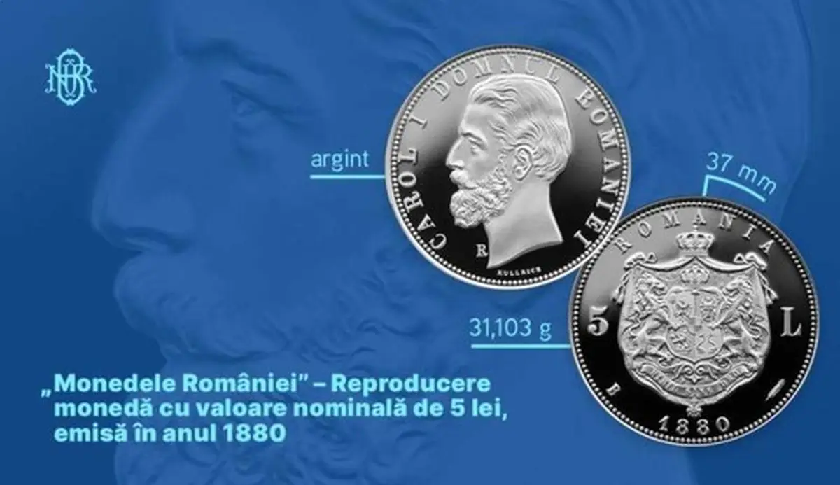 Banca Națională a României (BNR) lansează în circuitul numismatic, începând cu data de 16 martie 2026, o reproducere din argint după moneda de 5 lei emisă în anul 1880 din Seria ”Monedele României” – Reproducere monedă cu valoare nominală de 5 lei, emisă în anul 1880.