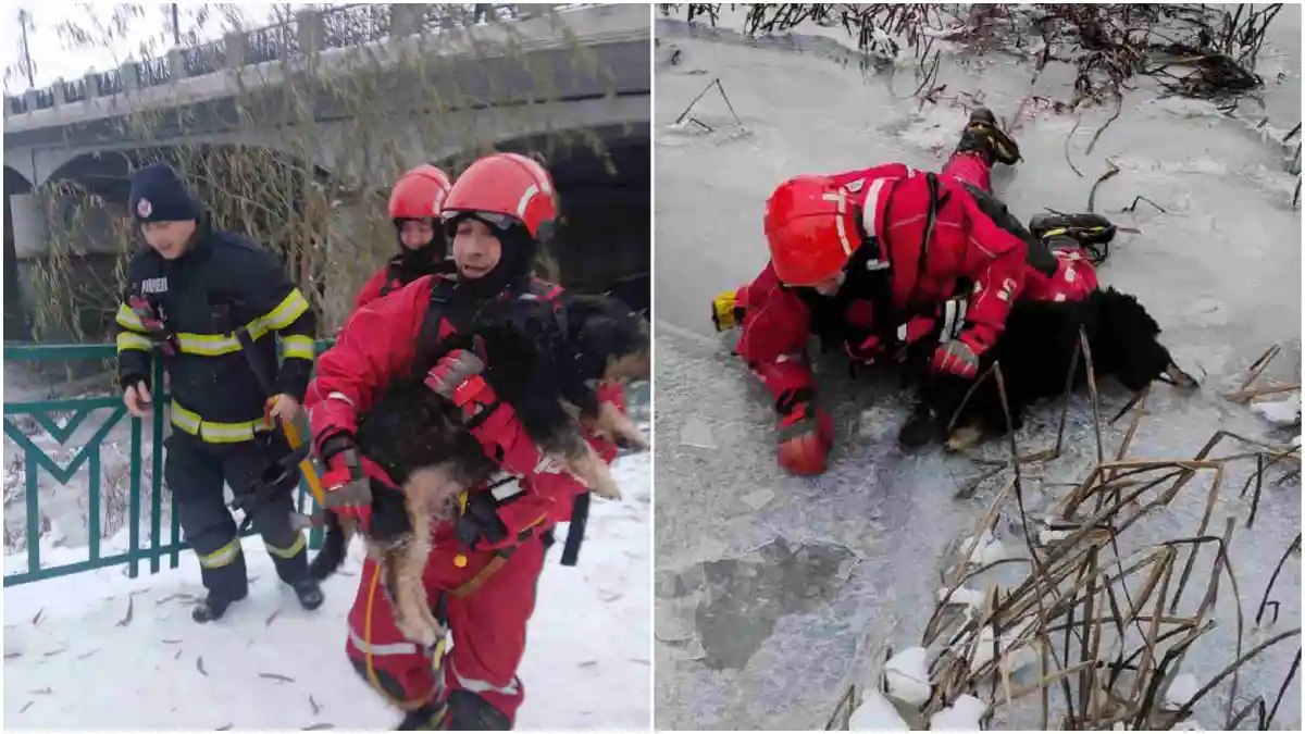 FOTO | Câine blocat între ghețuri salvat de pompieri: A căzut în apă după ce stratul de gheață de la suprafața râului a cedat sub acesta