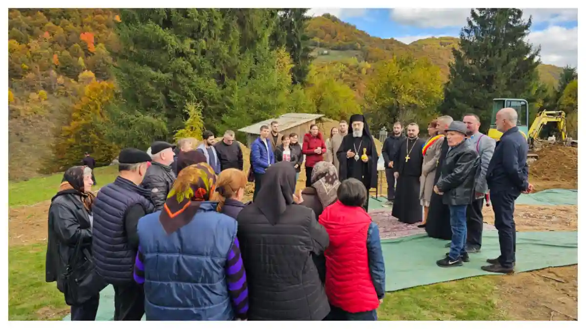 FOTO | Nou lăcaș de rugăciune la Ghioncani, după incendiul din Noaptea de Înviere de anul trecut care a distrus vechea biserică din lemn. Slujba punerii pietrei de temelie a avut loc