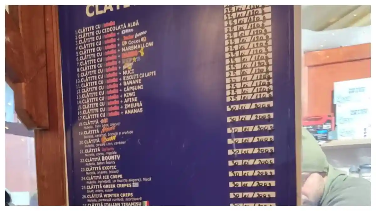 În ceea ce privește dulciurile, de exemplu, o porție de gogoși ,,most wanted” costă 30 de lei. Popcornul costă 10, respectiv 20 de lei, în funcție de gramaj, în timp ce cornulețele și saleurile se vând pentru 20 de lei. Un baton de ciocolată costă 15 lei, iar clătitele, în funcție de preferințele personale, între 20 și 30 de lei.