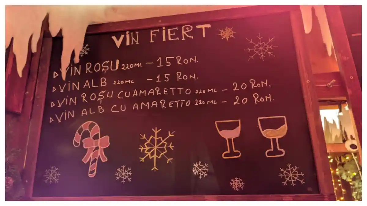 Pentru a bea un pahar de vin fiert simplu, roșu sau alb, vizitatorii trebuie să scoată din buzunar 15 lei, iar pentru opțiunea cu amaretto, 20 de lei. Berea și tăriile costă 15-20 de lei, iar sucurile 10 lei.
