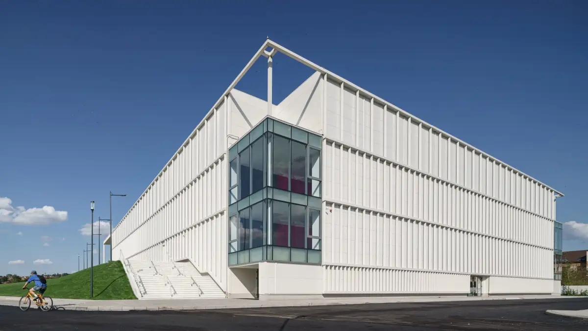 Faptul că fondurile pentru investiție au fost limitate a reprezentat o provocare pentru obținerea prioritară a unei clădiri flexibile și eficiente funcțional, în detrimentul unor gesturi arhitecturale inedite. Prin urmare, soluția urmărește cu abstinență alegerea unor sisteme constructive eficiente: elemente prefabricate de beton la nivelul gradenelor, structuri metalice simple ale acoperișului și închideri perimetrale din panouri termoizolante. Proiectul construiește astfel o imagine exterioară de o eleganță reținută, ce profită de ritmul unui trafor metalic a cărui umbră creează o dinamică vizuală a fațadelor. Ritmul consecvent al fațadei este întrerupt doar în dreptul holului principal orientat spre râu și prin vitraje de colț ce deservesc foaierele secundare și marchează accesele secundare. Printr-un gest invitațional asumat, spațiul evazat al porticului răspunde direcției principale de acces al publicului dinspre oraș.
