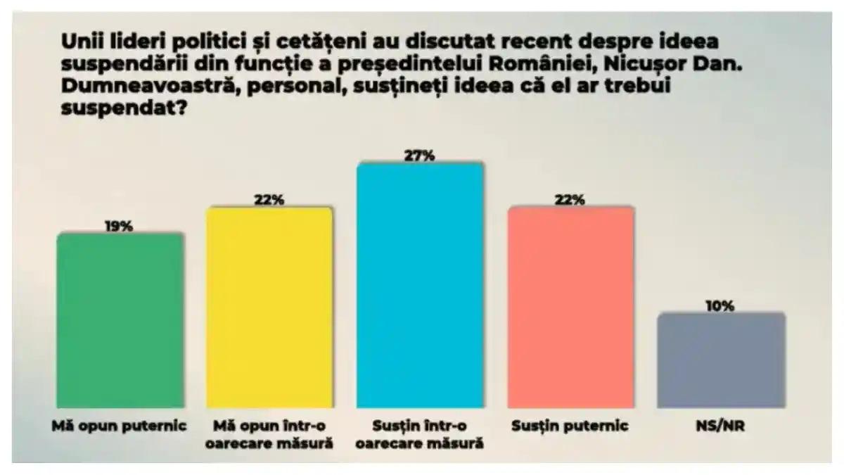În urma discuțiilor recente privind posibila suspendare a președintelui României, 49% dintre respondenți și-ar manifesta, într-o anumită măsură, susținerea pentru această măsură, în timp ce 41% se declară împotrivă, iar 10% nu au o opinie clară.