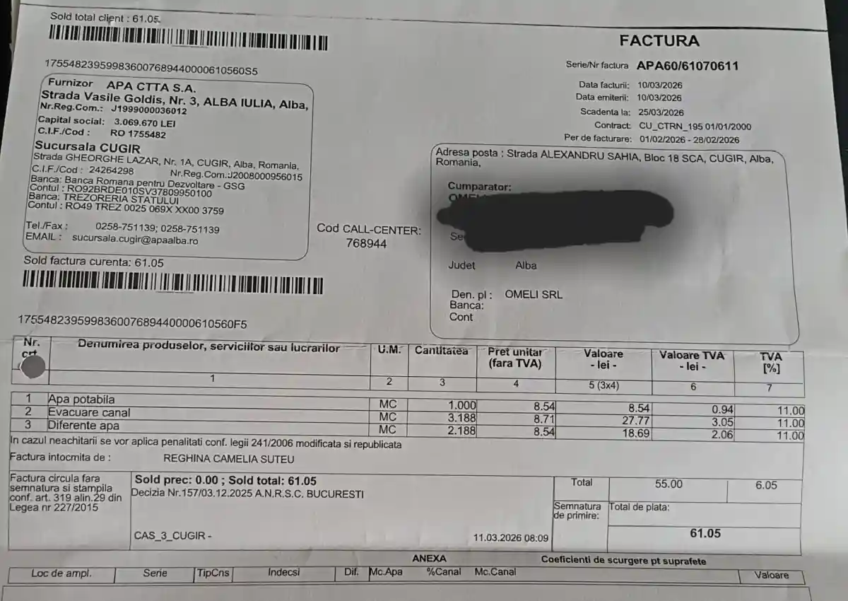 Pe factura postată pe rețelele de socializare apare un consum clar de 1 mc de apă, 3,188 mc evacuare canal și 2,188 mc pierderi. Totalul pentru cei peste 6 mc de apă facturați este de 61.05 lei, din care apa consumată efectiv ar costa 9,48 lei.