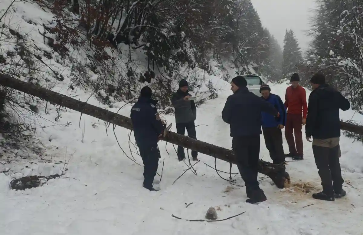 Trei persoane împotmolite în zăpadă, pe Valea Bistrei și trafic blocat: Copac căzut pe carosabil, îndepărtat de jandarmii montani și SVSU Bistra