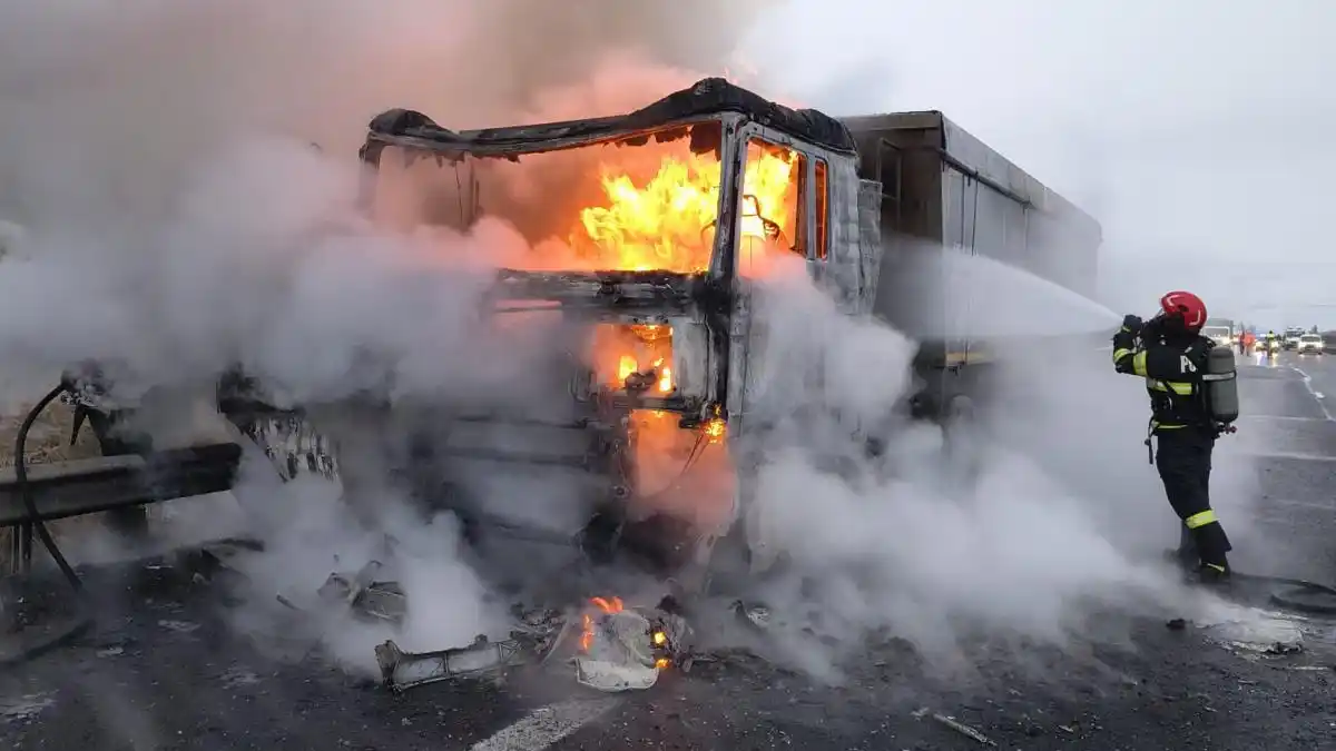 INCENDIU pe autostrada A1 Sebeș-Sibiu: Un ansamblu TIR cuprins de flăcări