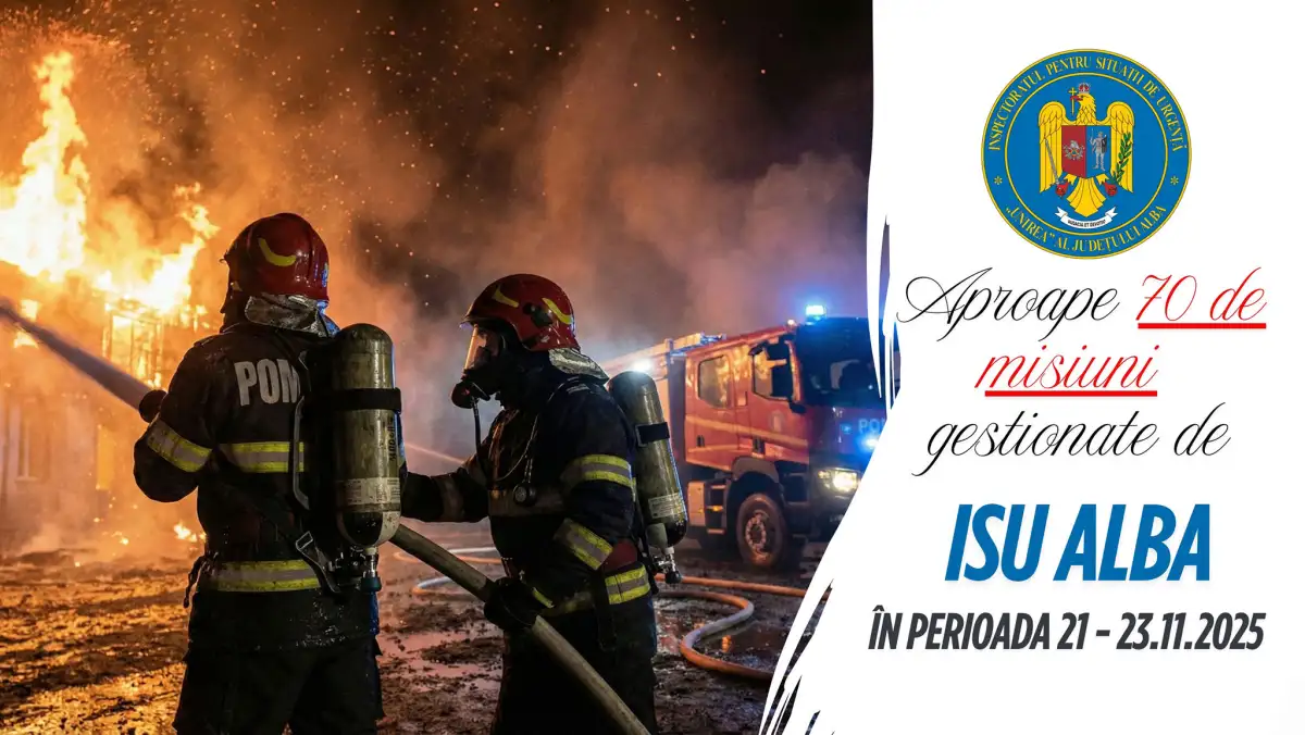Pompierii și paramedicii din cadrul ISU Alba au intervenit în aproape 70 de situații de urgență în perioada 21-23 noiembrie 2025, potrivit raportului transmis de instituție. Dintre acestea, 63 au fost misiuni SMURD, 2 incendii și 2 accidente rutiere.
