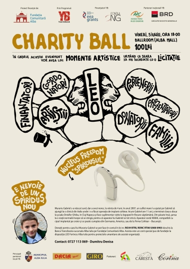 Charity Ball este un proiect finanţat de Fundaţia Comunitară Alba prin Programul YouthBank, având ca partener național BRD – Groupe Société Générale și principali parteneri locali Municipiul Alba Iulia, Dacia Market și Giro, Caresta, Mavaro şi Cofetǎria Corina. Puteți să ajungeţi în posesia unei invitații contactându-ne la numerele de telefon: 0727113069 – Dumitru Denisa; 0749889481 – Rusu Daria, iar daca doriți să-l ajutați pe Murariu Gabriel, dar nu reușiți să ajungeți la evenimentul nostru, puteți dona pentru cazul lui în contul în lei nr. RO39 BTRL RONC RT00 U000 0903 deschis la Banca Transilvania sucursala Alba Iulia pe Fundația Comunitară Alba, fiind un cont special pus de fundație la dispoziția LEO Fortress Alba Iulia pentru proiectele umanitare ale acestei organizații.