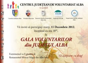 Marţi, 11 decembrie 2012, începând cu ora 18.00, la restaurantul „Mercur Magic” din Alba Iulia va avea loc Gala Voluntarilor din judeţul Alba. Manifestarea este organizată de Centrul judeţean de Voluntariat, cu sprijinul Consiliului Judeţean Alba, al Primăriei Alba Iulia, al Casei de Cultură a Studenţilor din Alba Iulia, al Federaţiei „Volum” şi al Inspectoratului Şcolar Judeţean Alba.