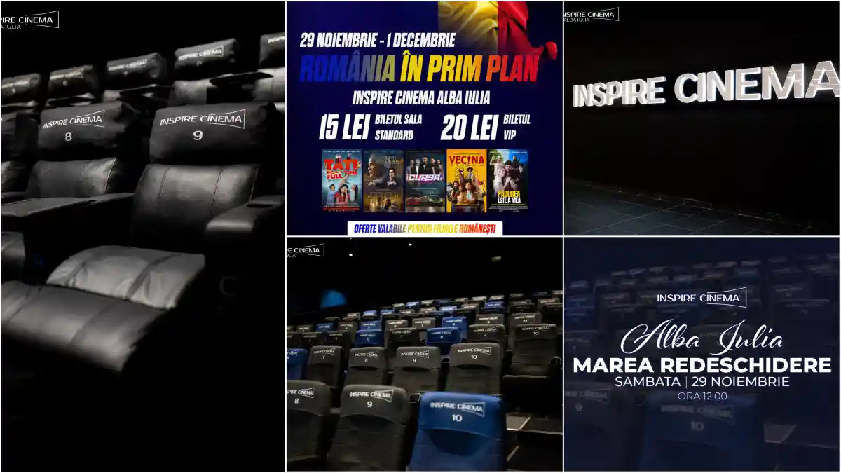 Inspire Cinema Alba Iulia își redeschide porțile pentru public sâmbătă, 29 noiembrie 2025, la ora 12:00. Publicul este invitat să redescopere cinemaul într-un spațiu complet modernizat, dedicat pasionaților de film și celor care caută o experiență de calitate.