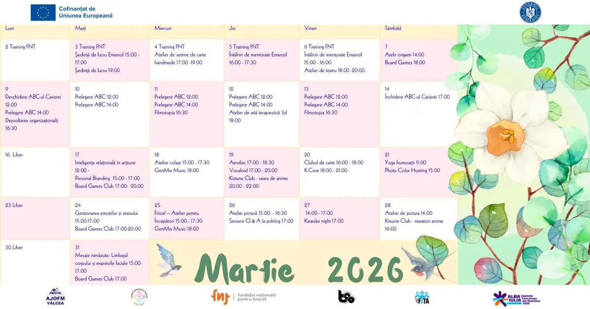 Martie 2026, o lună plină de energie, idei și comunitate pentru tineri, la Fundația Județeană pentru Tineret Alba: Traininguri, ateliere creative, sesiuni de mentorat, activități sportive, cluburi tematice și evenimente culturale. PROGRAMUL